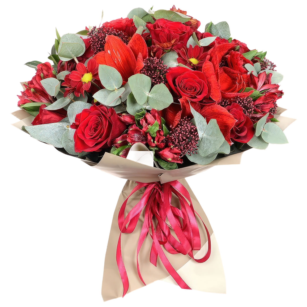 Амарилис, роза одноголовая красная, хризантема кустовая красная, альстромерия красная, эвкалипт, скиммия. Упаковка (лента, пленка, крафт, сетка, пленка матовая)