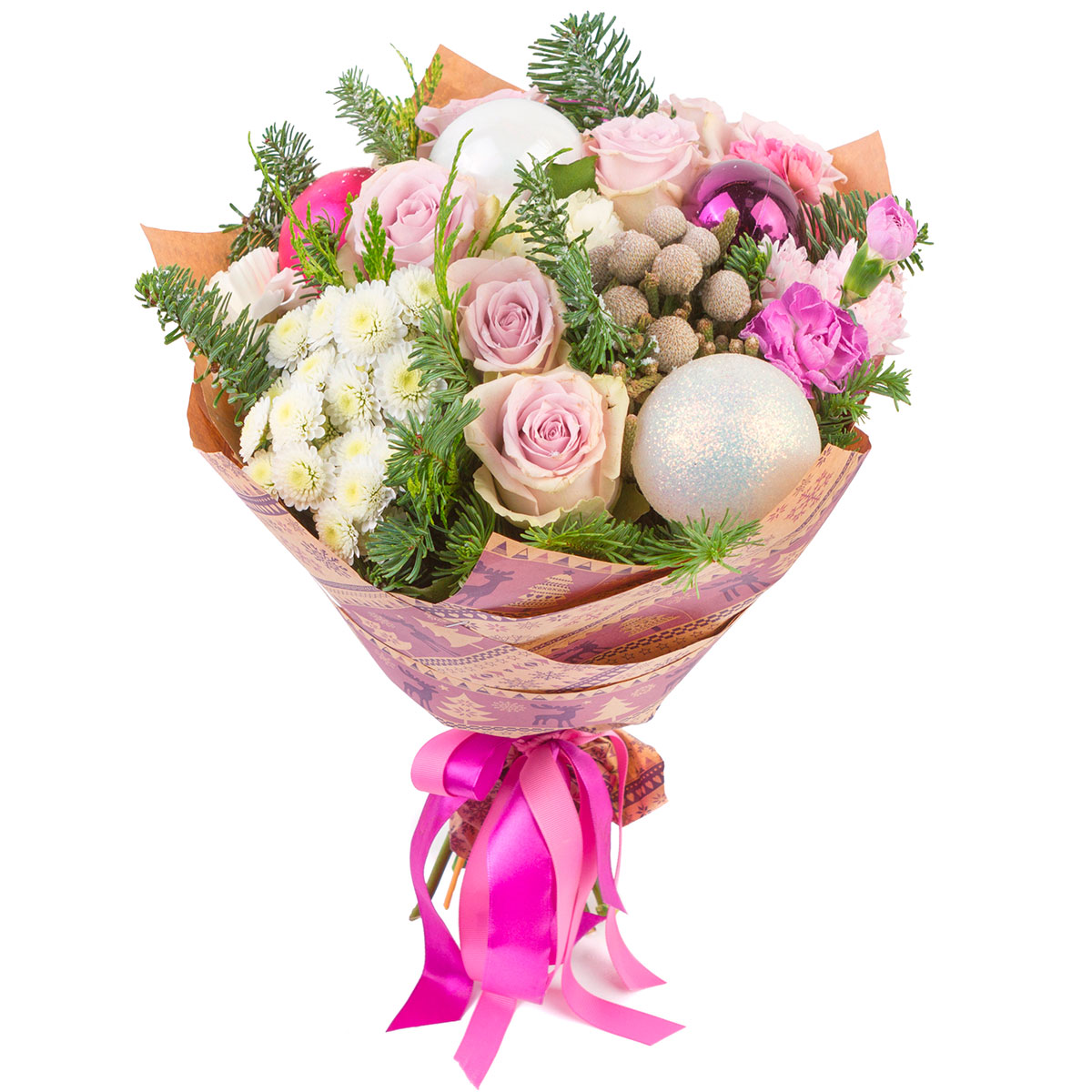 Роза одноголовая сиреневая, хризантема кустовая белая, маттиола, бруния, пихта, декоративные шары. Упаковка (лента, пленка, крафт, сетка, пленка матовая)
