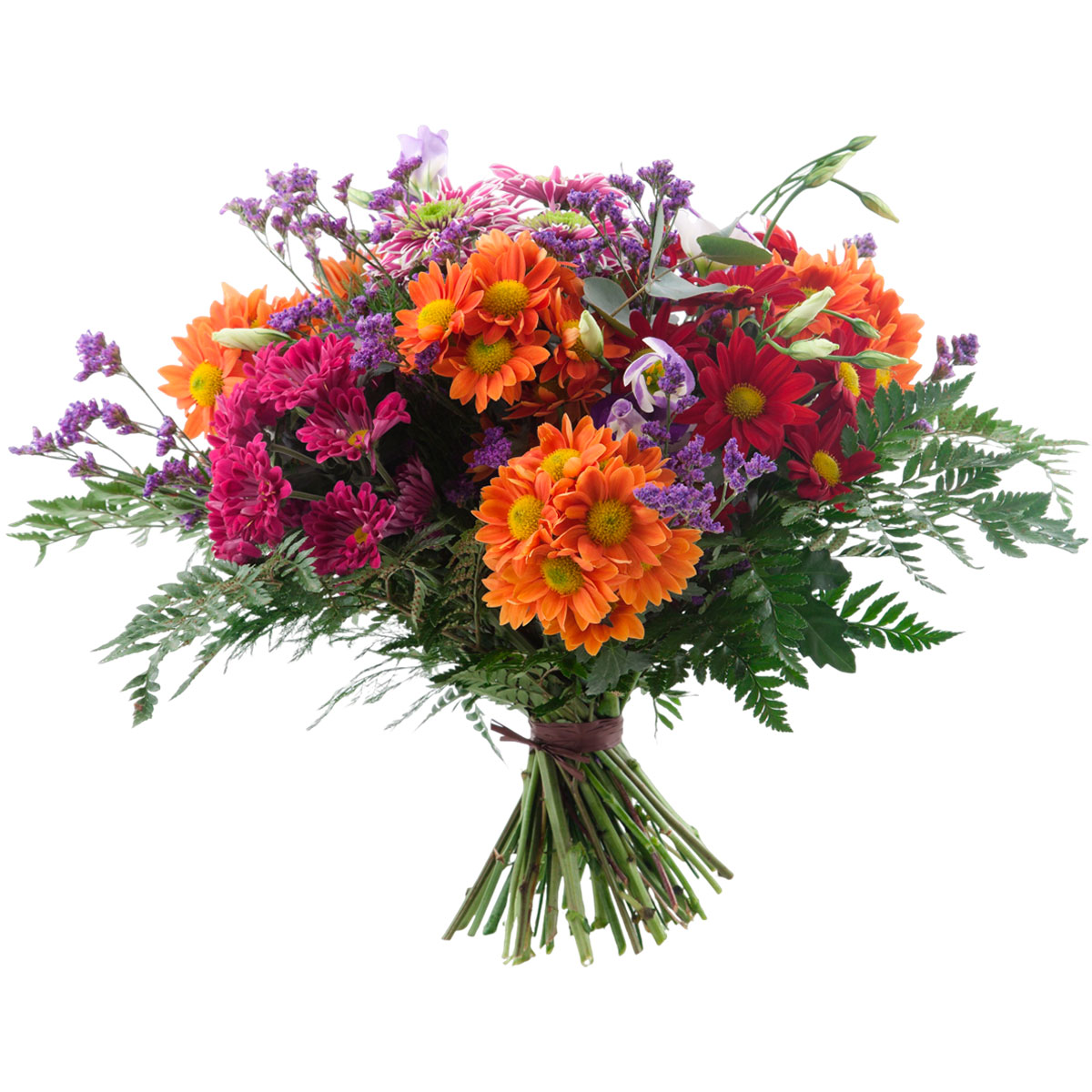 Хризантема оранжевая, красная и розовая, хризантема мексикано, эустома сиреневая, эвкалипт, статица фиолетовая, зелень. Упаковка (лента, пленка, крафт, сетка, пленка матовая)