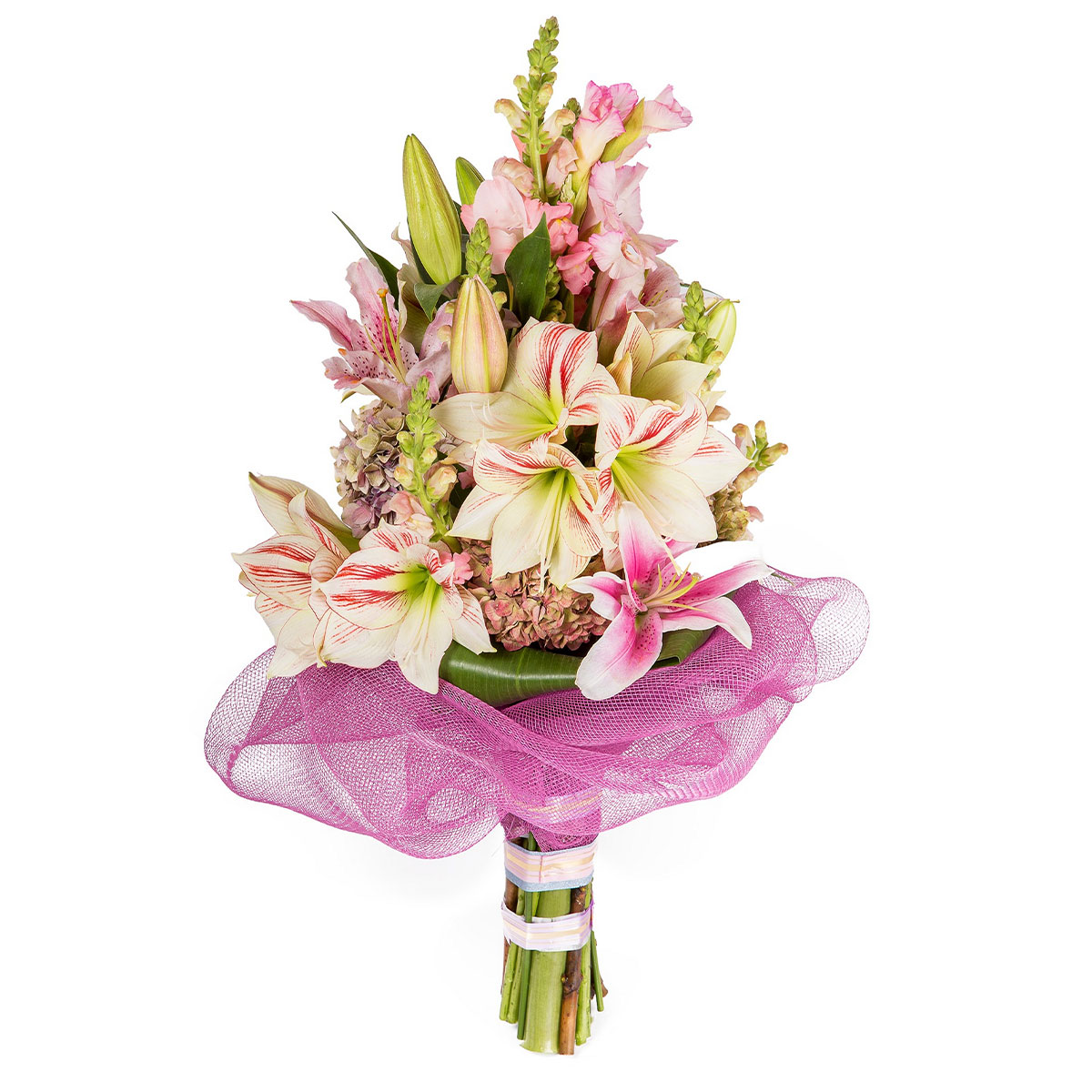 Лилия розовая, гиппеаструм, гортензия, гладиолус розовый, аспидистра. Упаковка (лента, пленка, крафт, сетка, пленка матовая)