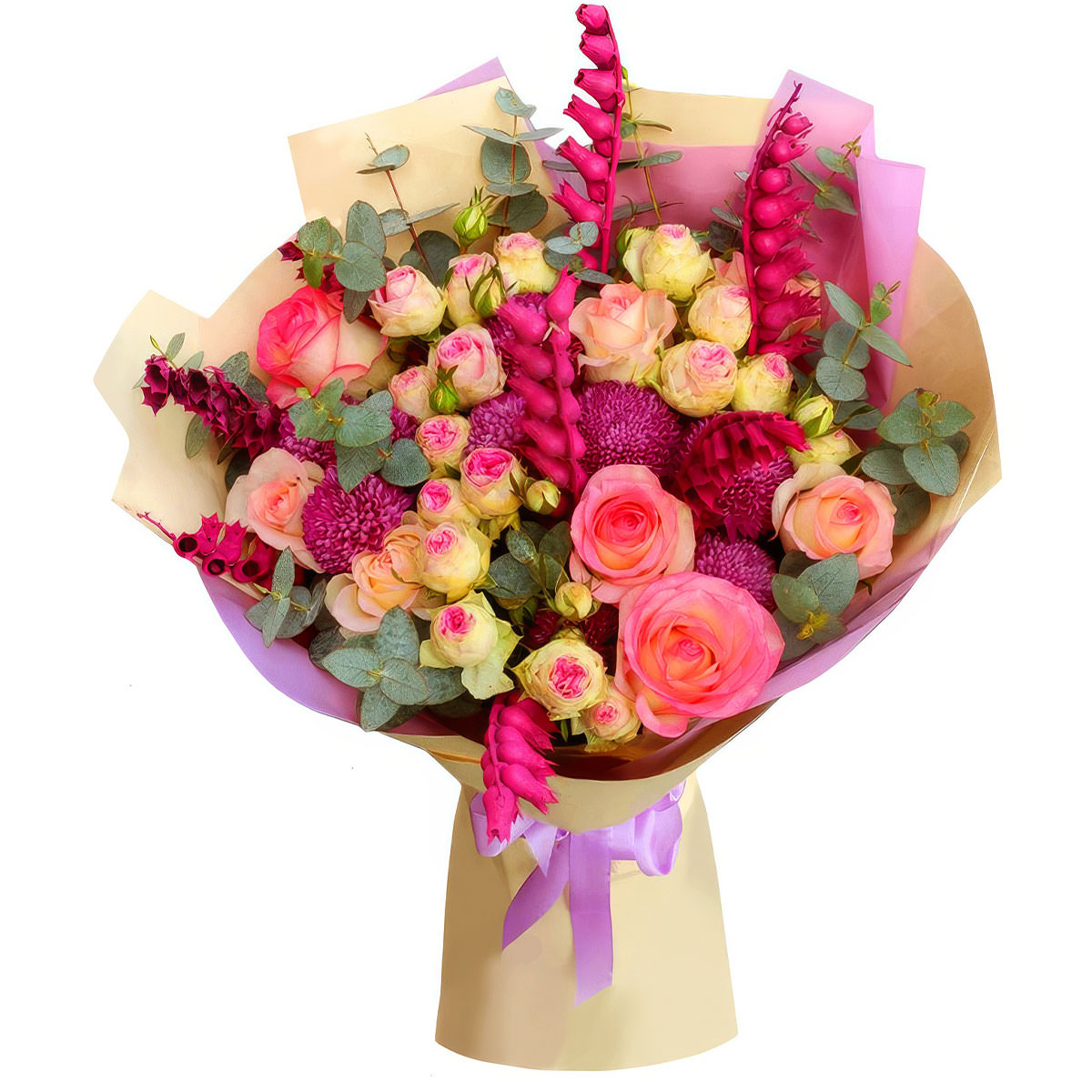 | Состав | Астры, Львиный зев, Пионовидные розы, Розы, Эвкалипт |