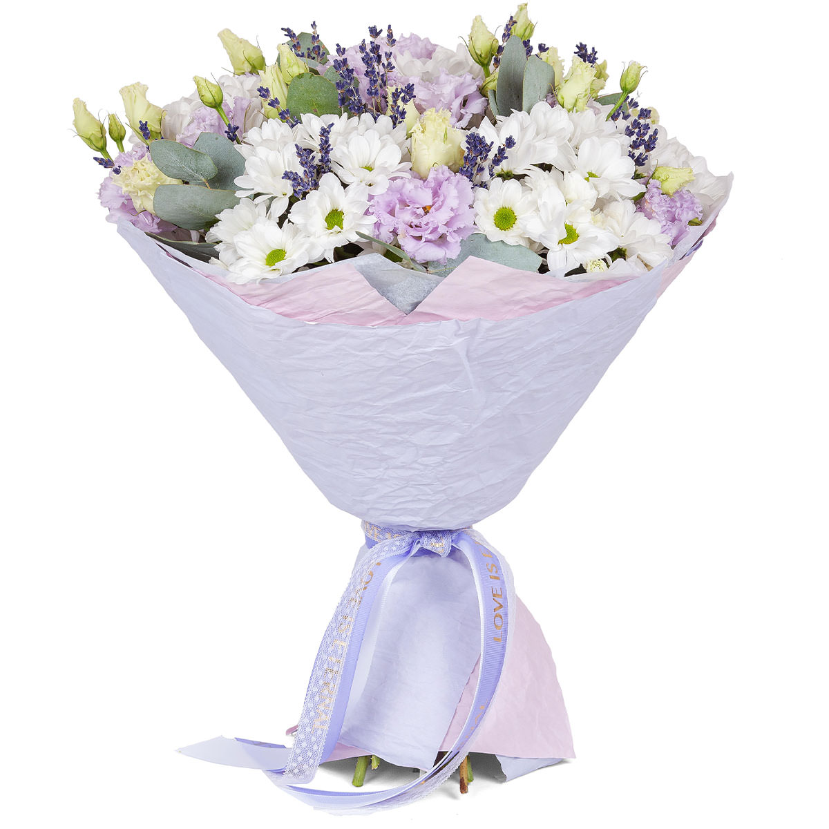 Хризантема кустовая белая, эустома белая и сиреневая, лаванда, эвкалипт. Упаковка (лента, пленка, крафт, сетка, пленка матовая)