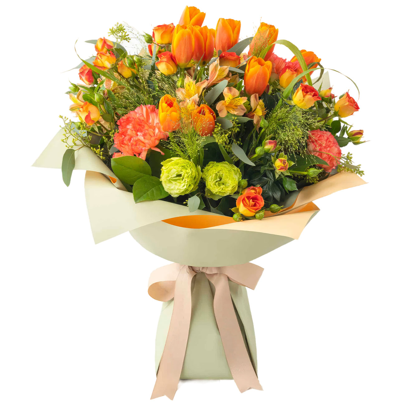 Тюльпан оранжевый, роза кустовая кенийская оранжевая, гвоздика оранжевая, альстромерия персиковая, эустома зеленая, зелень. Упаковка (лента, пленка, крафт, сетка, пленка матовая)