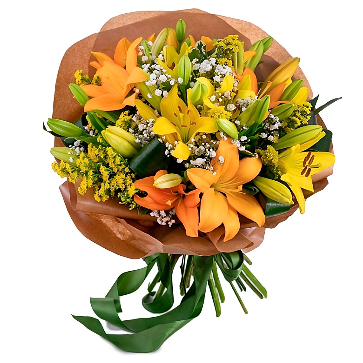 Лилия желтая, оранжевая, гипсофила белая, зелень. Упаковка (лента, пленка, крафт, сетка, пленка матовая)