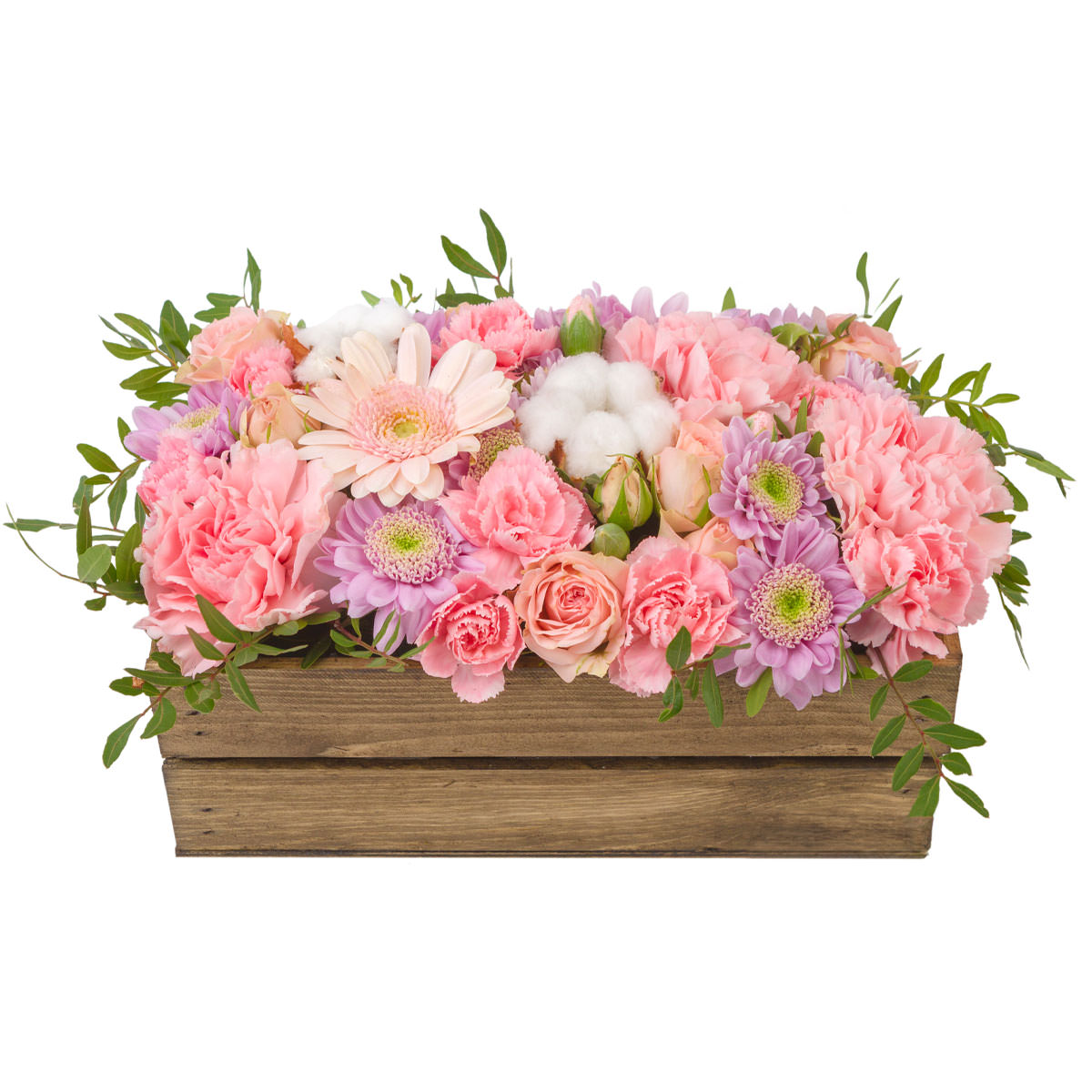 Гербера сиреневая и розовая, гвоздика розовая, роза кустовая розовая, хлопок, фисташка. Упаковка (Корзина, оазис, ящик).