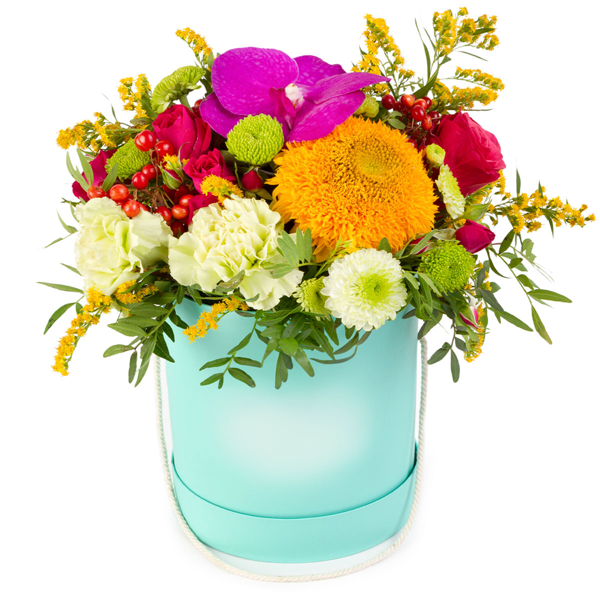Орхидея Ванда, гвоздика кремовая, роза кустовая розовая, подсолнечник тедди беар, хризантема кустовая зеленая и белая, гиперикум, солидаго, фисташка. Упаковка (шляпная коробка, квадратный бокс, коробка сердце, оазис)