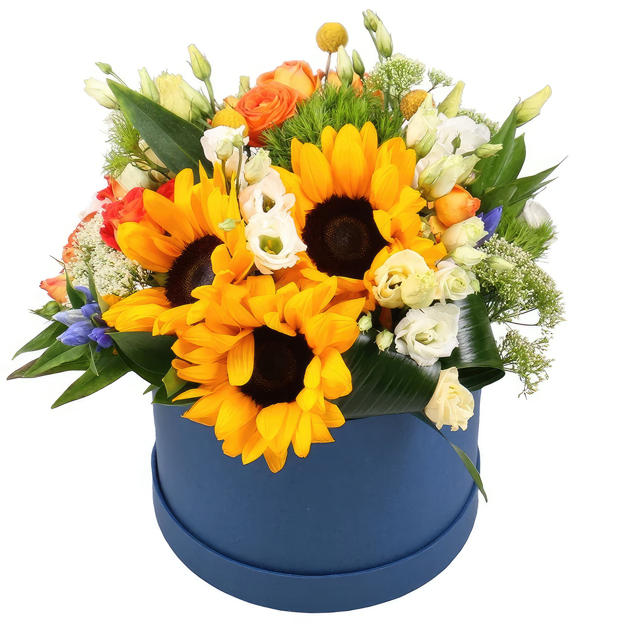 Цветы в коробке «Подсолнечное настроение» с доставкой по г Кирс: вы можете купить букет в цветочном интернет-магазине «Флормания» по цене от 3190 руб.