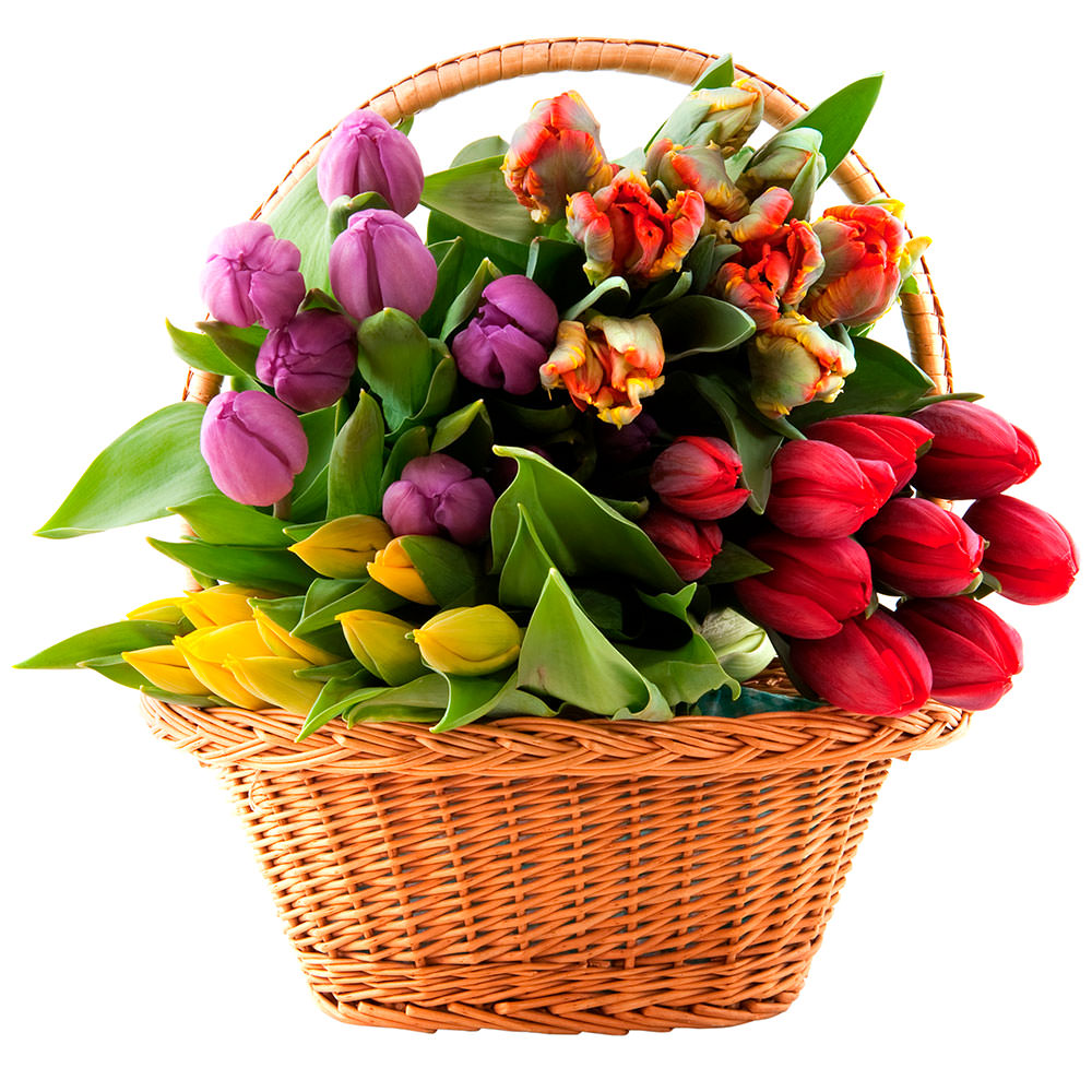 Цветы в корзинке «Микс тюльпанов» с доставкой по г Кирс: вы можете купить букет в цветочном супермаркете «Флормания» по цене от 3490 руб.